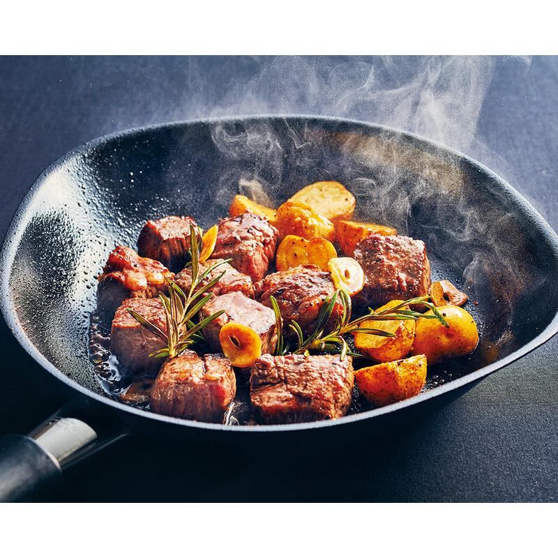 両面に繊維状の凹凸を浮き立たせ、鉄の表面を窒素で硬化させる「窒化加工」を施したフライパン。より高い耐腐食性と耐摩耗性を持っています。