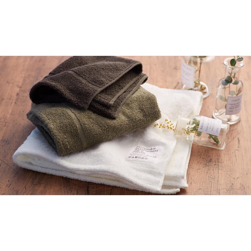 国際認証取得オーガニックコットン100%の肌にやさしく上質な使い心地。ソフトな中厚手タイプで吸水力が良いタオルです。国際的な認証を多数取得している海外の工場で生産しており、工場で出たエネルギーは循環させて再利用にも取組んでいます。