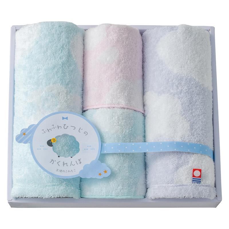 まるで雲のような、ふんわりとした柔らかさが特徴のタオルです。糸の撚りをゆるく「甘撚り」した、通常の糸より柔らかい糸で織り上げています。かわいらしいひつじの柄をあしらい、やさしい色合いに仕上げました。