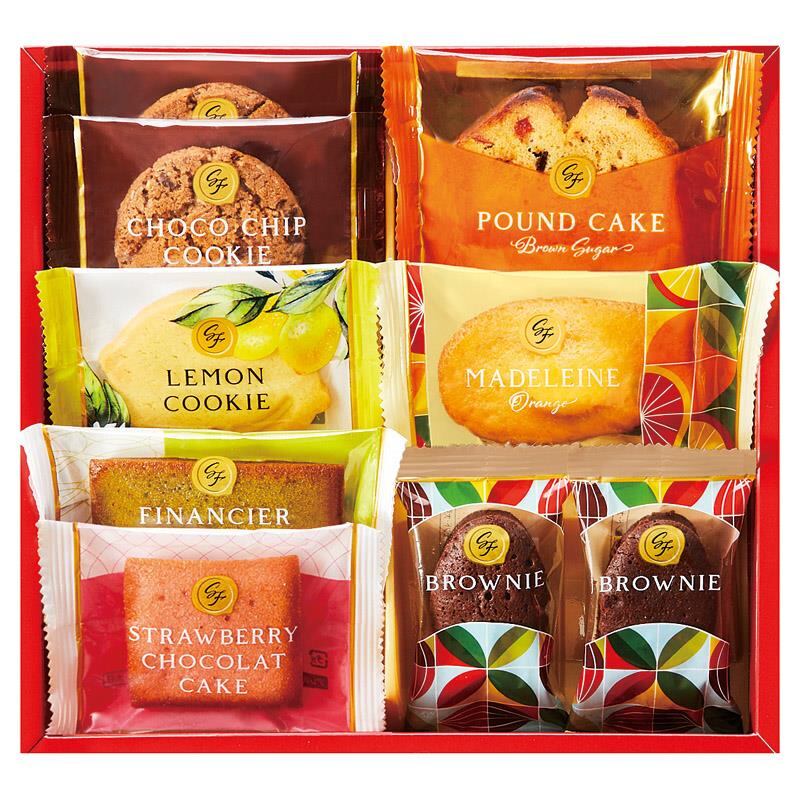商品内容:オレンジマドレーヌ・ストロベリーショコラケーキ・ピスタチオフィナンシェ・ブラウンシュガーパウンドケーキ・レモンクッキー×各1、チョコチップクッキー・ブラウニー×各2