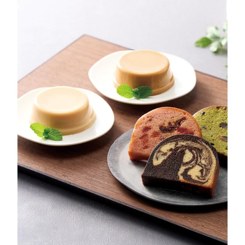 商品内容:キャラメルプリン(70g)・カットケーキ(ベリー・マーブル・抹茶金時)×各2、カスタードプリン(70g)×1