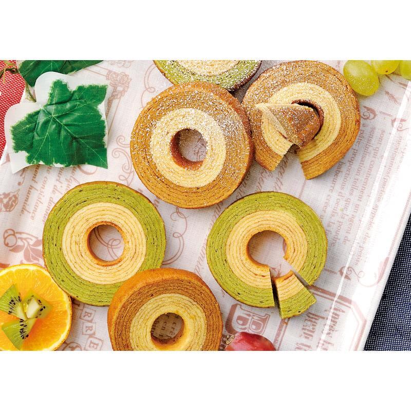 商品内容:2層バームクーヘン(キャラメル&ミルク×3、抹茶&ミルク×2)