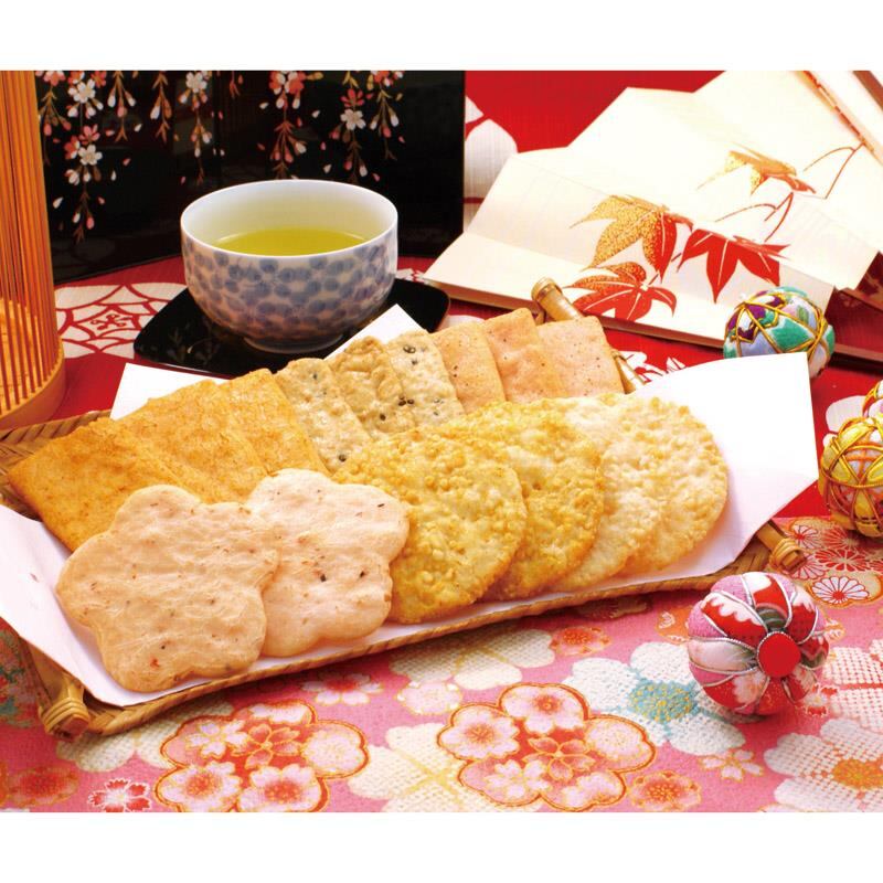 商品内容:金澤カレー煎餅・えびまめ花煎餅・海老胡椒煎餅×各8、黒ごま入り玄米煎餅・海老カレー煎餅×5、つぶやきサラダ煎餅×4