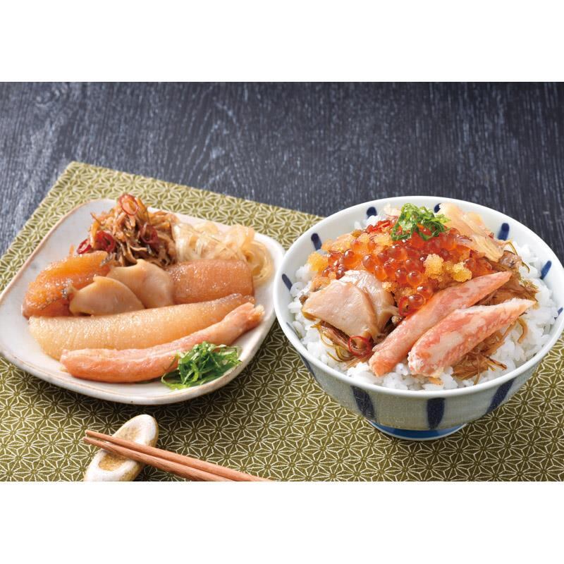 ご飯にのせるだけで贅沢海鮮丼 数の子がたっぷり入った松前漬をベースに、海の高級食材と言われるいくら(国産)・あわび(国産)・ふかひれ(国産・気仙沼加工)を贅沢にトッピング。更にずわい蟹棒肉も2本盛付け、見た目もより鮮やかに仕上げました。