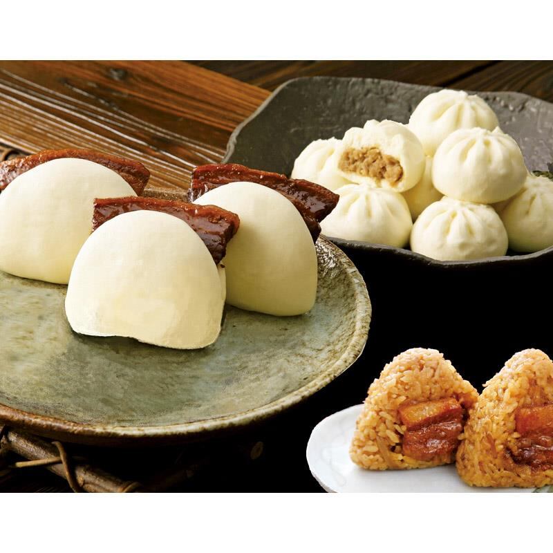 人気のミニ豚まんに角煮を挟んだ角煮まんじゅう、煮汁で味付けおにぎりに角煮をのせた詰合せです。