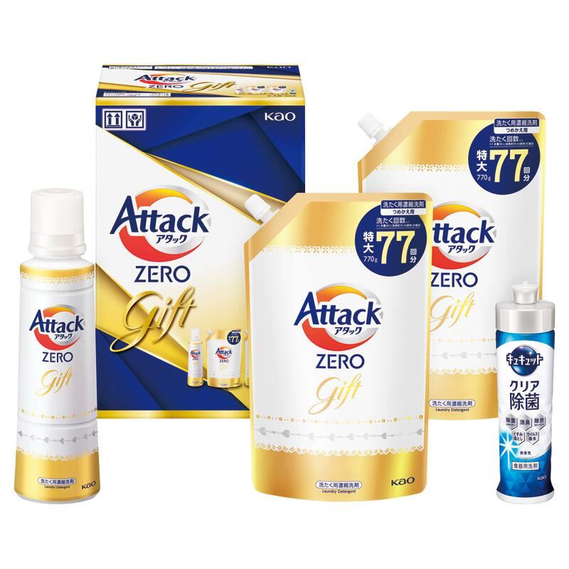 商品内容:アタックZERO(580g)・キュキュットクリア除菌(220ml)×各1、アタックZERO詰め替え(770g)×2