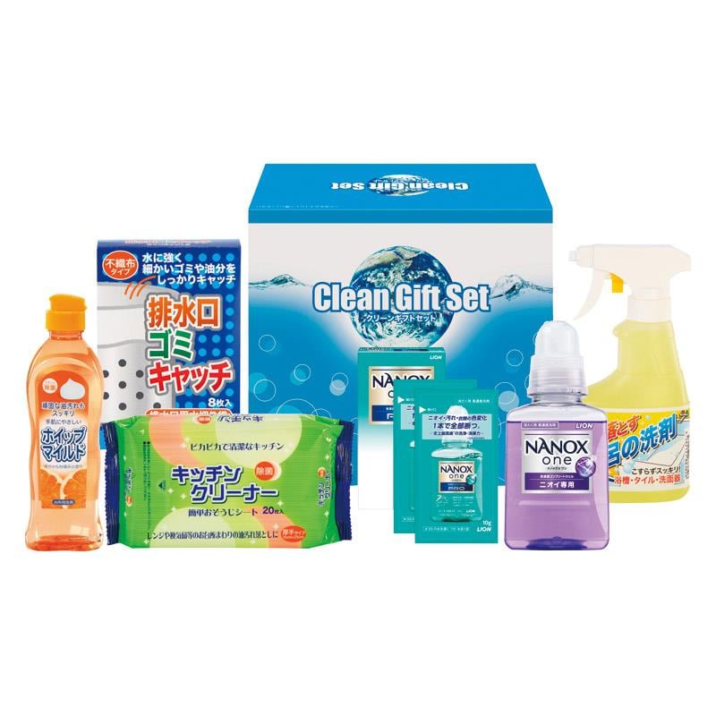 商品内容:ライオンナノックスワンニオイ専用(380g)・ライオンナノックスワンプロ(10g×2包)・台所洗剤(250ml)・お風呂の洗剤スプレー(300ml)・キッチンクリーナー20P・排水口ゴミキャッチ8P×各1