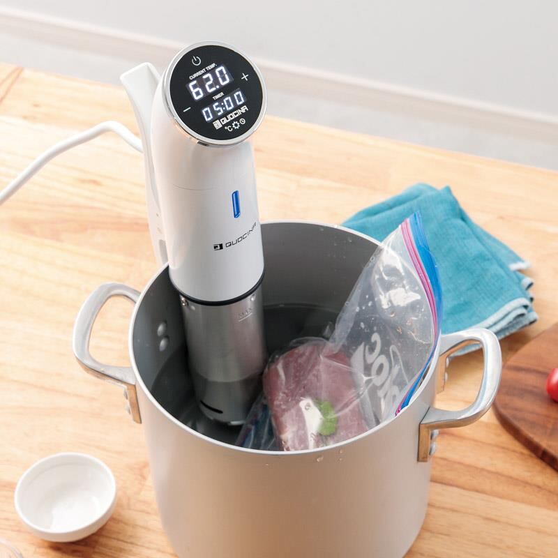 低温で調理する事で、柔らかく、旨味成分が逃げ出さない美味しい調理が可能に。クリップを鍋縁に挟み固定できるので調理中も安心。万が一に備えIPX7の防水仕様。