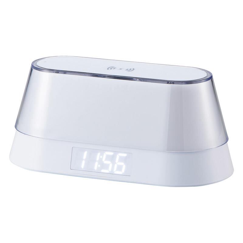 ワイヤレススピーカー・ワイヤレス充電・ナイトライト機能付きの便利なオールインワン多機能クロック。アラームと連動してライトが点灯し、光でも目覚めをアシストするウェイクアップライト機能付。■ワイヤレススピーカー■ワイヤレス充電(最大10W)■時計■アラーム■スヌーズ■ナイトライト(7色)■アラーム連動ウェイクアップライト