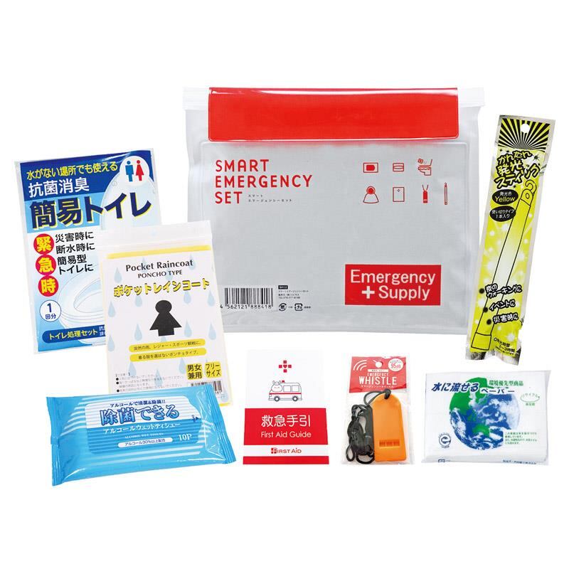 商品内容:防水ケース(約195×233mm)×1、ホイッスル・発光スティック・レインコート・抗菌消臭簡易トイレ・救急手引・除菌アルコールウェットティッシュ・水に流せるペーパー(8W)×各1