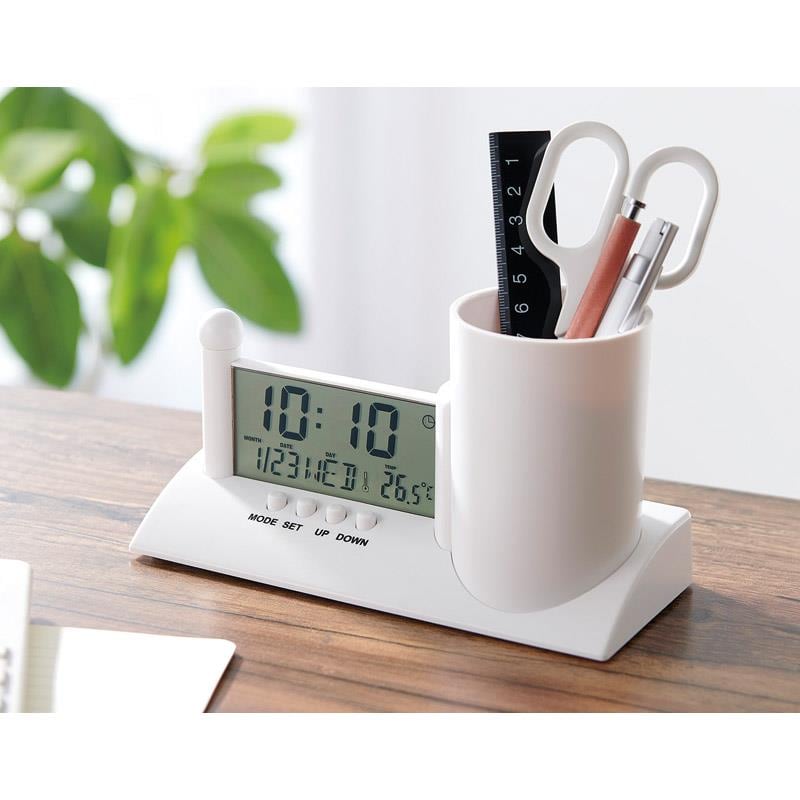 便利なペンホルダー付の多機能マルチクロックです。○時計○アラーム○スヌーズ○カレンダー温度計○カウントダウンタイマー○誕生日お知らせ