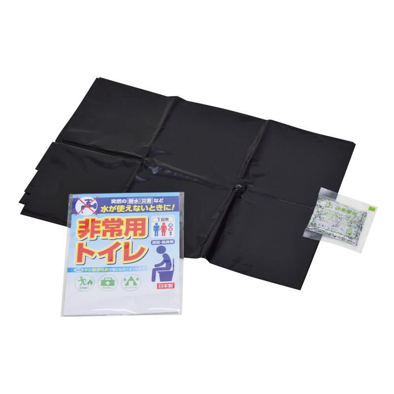 水が使えない時の簡易トイレ。高分子ポリマー(凝固剤)が水分に即反応して、排泄物を素早く固めます。ヤシ殻活性炭配合で消臭効果もあります。