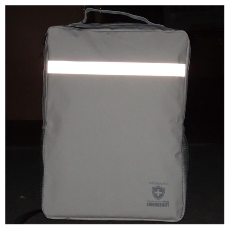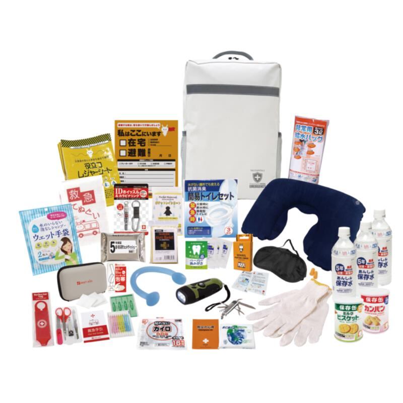 付属品:収納リュック・リフレクター・IDホイッスル&カラビナリング・ウエットティッシュ(日本)・軍手・アルミブランケット・防災の心得(日本)・ダイナモマルチライト・カンパン(日本)・ミルクビスケット(日本)・給水袋3L(タイ)・スリッパ・カイロ(日本)・レインコ