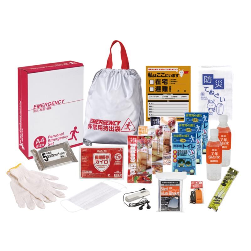 付属品:非常用持出袋・ホイッスル・ウェットティッシュ(日本)・マスク・軍手・静音アルミブランケット・発光スティック・7年保存水500ml×2(日本)・バランススティック×3(日本)・カイロ(日本)・携帯用トイレ×3・FMラジオ・防災てぬぐい・緊急避難カード(日本)・取説