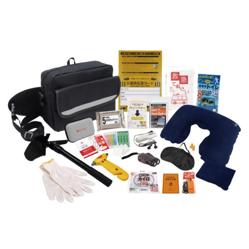 付属品:収納バッグ・防災の心得(日本)・ホイッスル・カイロ(日本)・レインコート・携帯用トイレ・ダイナモLEDライト・FMラジオ・軍手・静音アルミブランケット・救急てぬぐい・防災用ウエットティッシュ(日本)・ネックピロー・アイマスク・耳栓・災害時伝言カード(日本)・