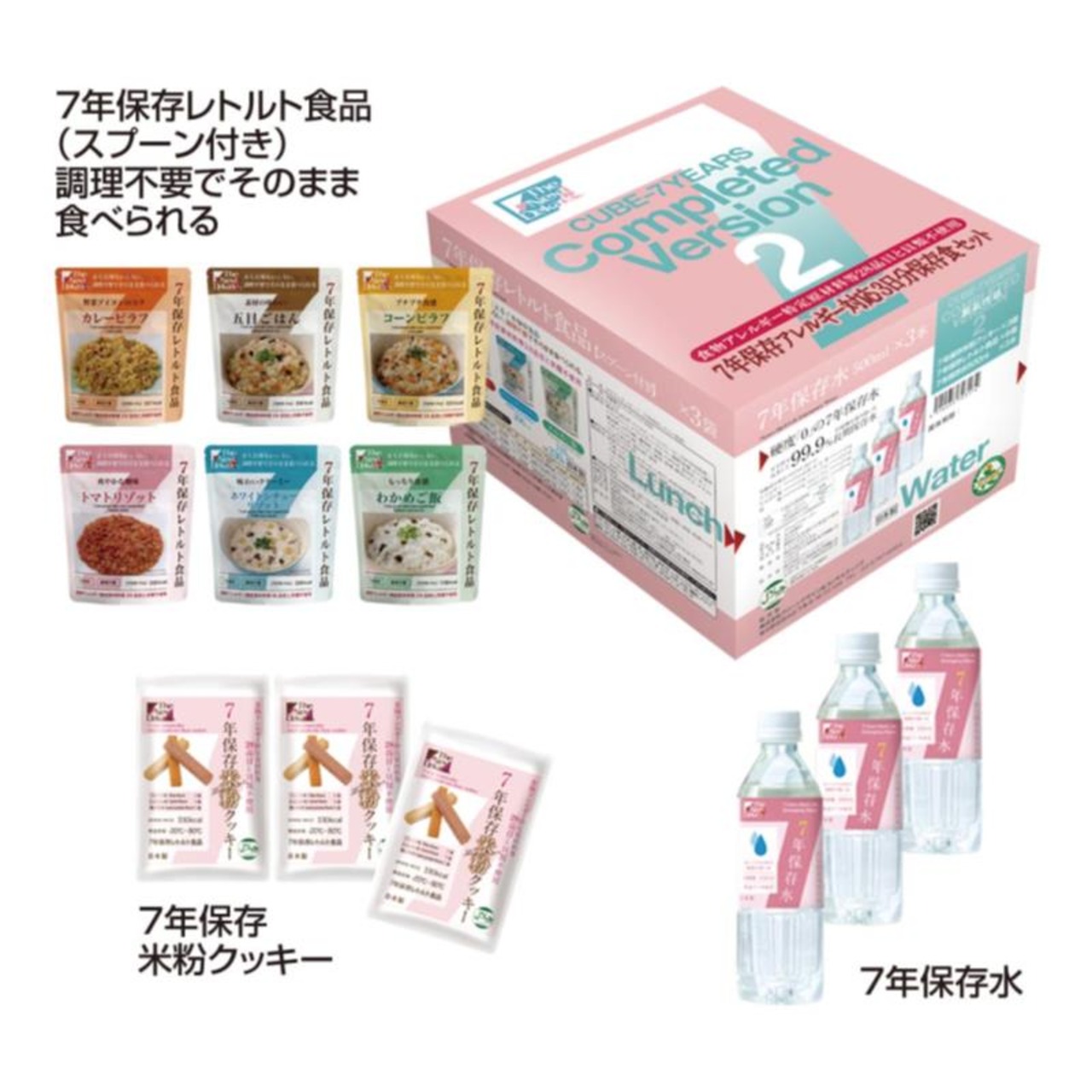 付属品:7年保存米粉クッキー×3・7年保存レトルト食品×6・7年保存水500mL×3