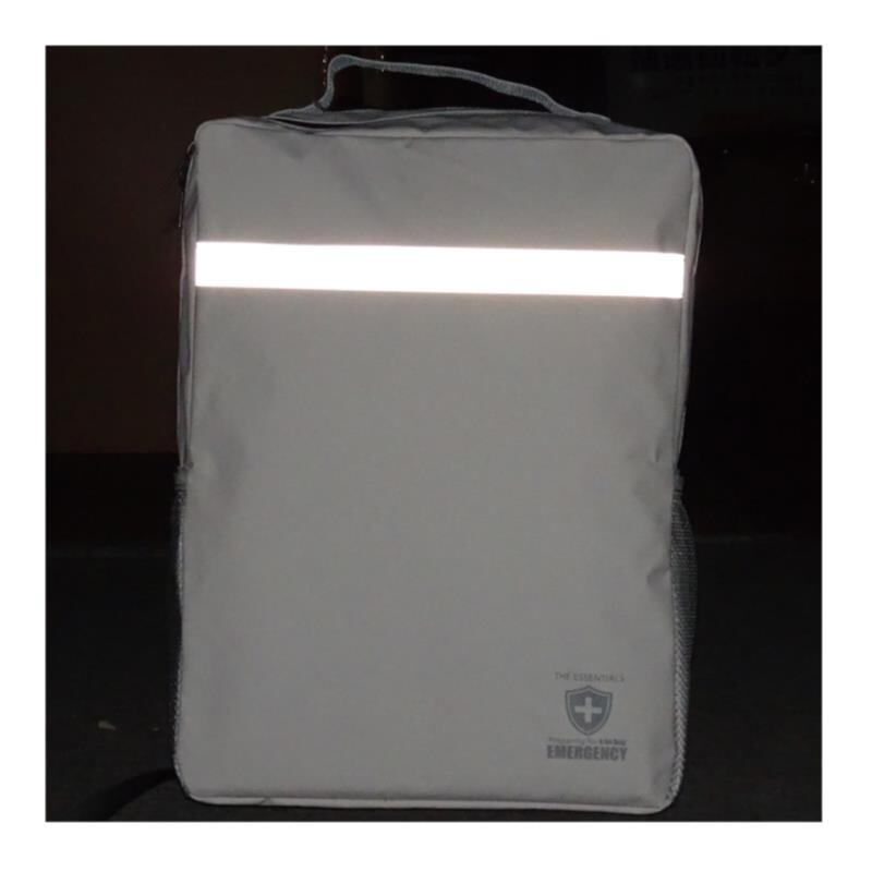 現品サイズ:水をはじきやすいターポリン素材を使用したリュック。水の浸入を防ぐ止水ファスナーも採用。チェストベルトには緊急時のホイッスル付き。停電時も見つけやすい蓄光プリントや、夜道も安心な反射テープ、物を吊るせるD管やステッチ・背面ポケットなど機能充実。