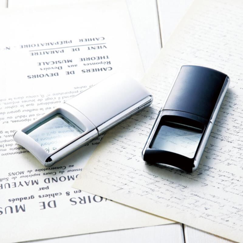 現品サイズ:倍率3倍&ライト2球の明るいスライド式ルーペ。スタイリッシュなデザインは名入れにも最適です。