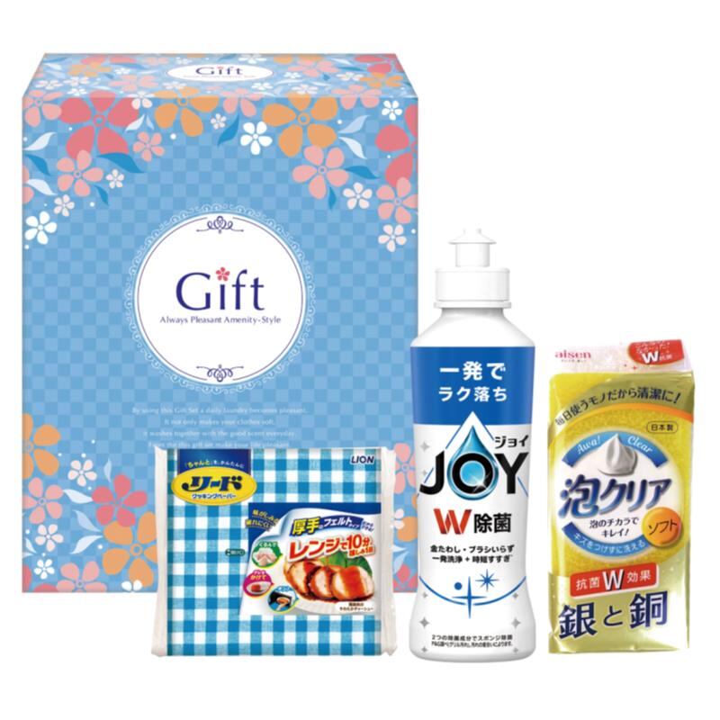 現品サイズ:少しの量で汚れ落ち抜群のP&G除菌ジョイと調理に使えるライオンリードクッキングペーパー、泡立ち豊かなスポンジのセットです。