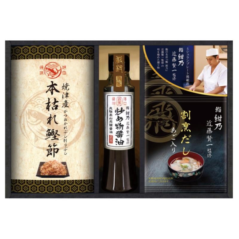 付属品:鮨 紺乃 近藤賢一監修 あご入り割烹だしパック×4・鮨 紺乃 近藤賢一監修 飛騨高山炒め物醤油200ml・焼津産 本枯れ鰹節15g