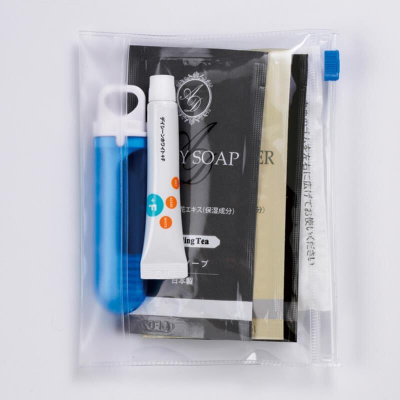 付属品:ハミガキ粉8g・ハブラシ・メリットシャンプー16mL・メリットリンス16mL・ビオレU16mL・シャワーキャップ