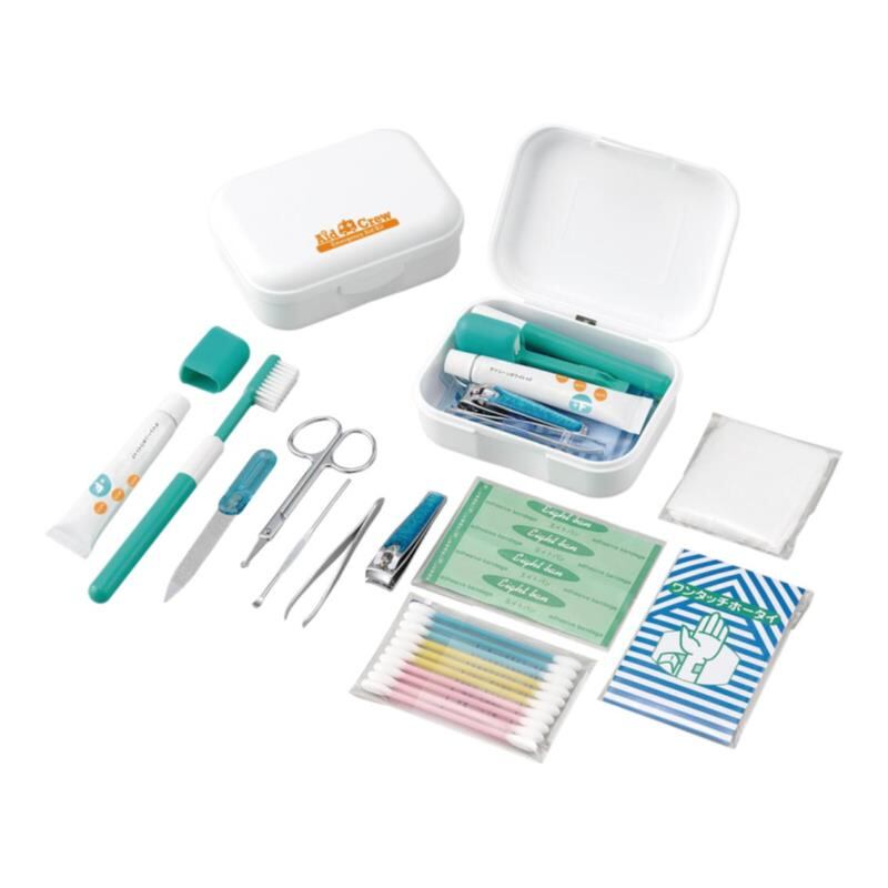 付属品:日本製:専用ケース、キズテープM×3、ワンタッチ包帯、コットンパフ×3、歯ブラシ(カバー付)、歯磨き粉・中国製:爪切り、エチケットハサミ、耳かき、毛抜き兼ピンセット、爪ヤスリ・タイ製:カラー綿棒×10