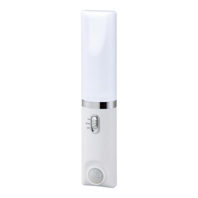 現品サイズ:暗いときに人が通ると反応するセンサーライトと常備灯の切替式。ライト部分を取り外して懐中電灯としても使えます。