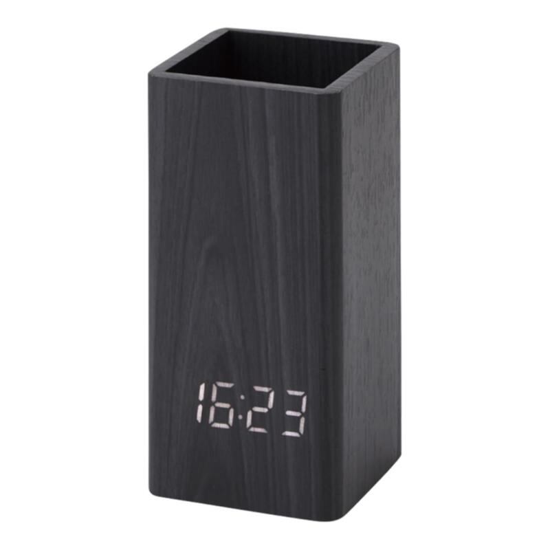 現品サイズ:ペンスタンド機能の付いた、スタイリッシュな木製LEDクロックです。