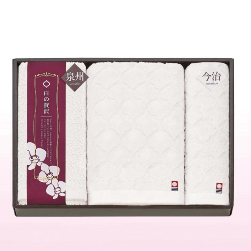 現品サイズ:華麗で胡蝶蘭のような織柄をあしらった今治製と、吸水性がよく、ハンガーで干しやすいスリムサイズの泉州製。各産地の美しい白いタオルセットです。